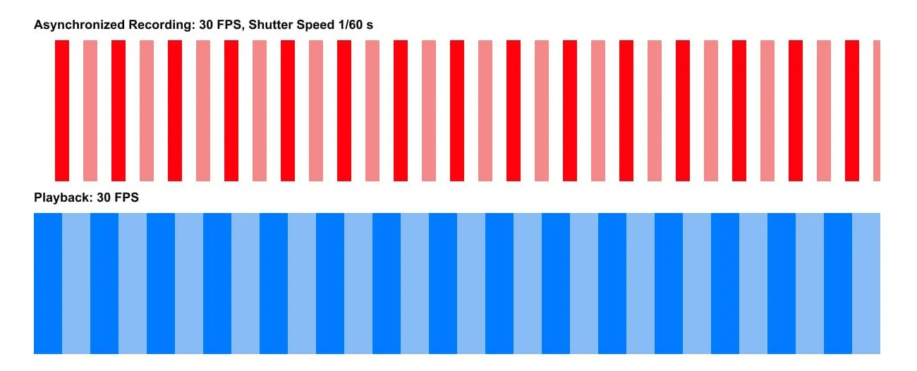 For instance, what if the original video is being played back at an average of 30 fps with every frame being displayed for 1/30 s? If the iPhone is recording at 30 fps with a shutter speed of 1/60 s (a common ratio, but shutter speed varies), you might get lucky with synchronicity between videos and receive clean versions of all original frames. That would look like this (where the top represents the recording and the bottom represents the playback):