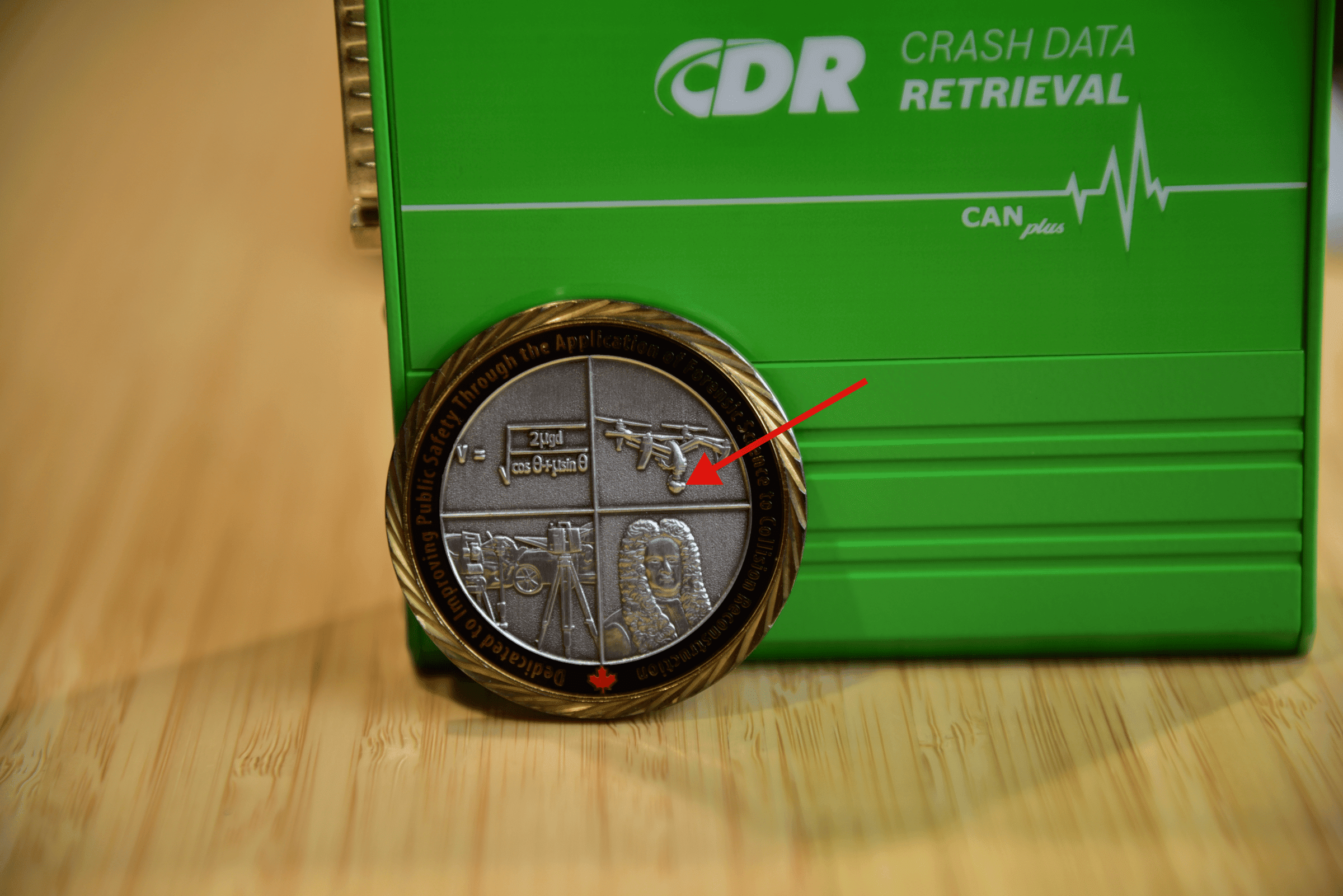 Back in 2024, we explored the macro capabilities of a Nikon D750 (equipped with a 24-120 mm lens), an iPhone, and the famous Olympus TG-6, with ICARs’ beautiful challenge coin as the subject. Now, let’s see how much detail we can see with this cheap microscope. We’ll focus on the drone's camera, as identified by the red arrow below.