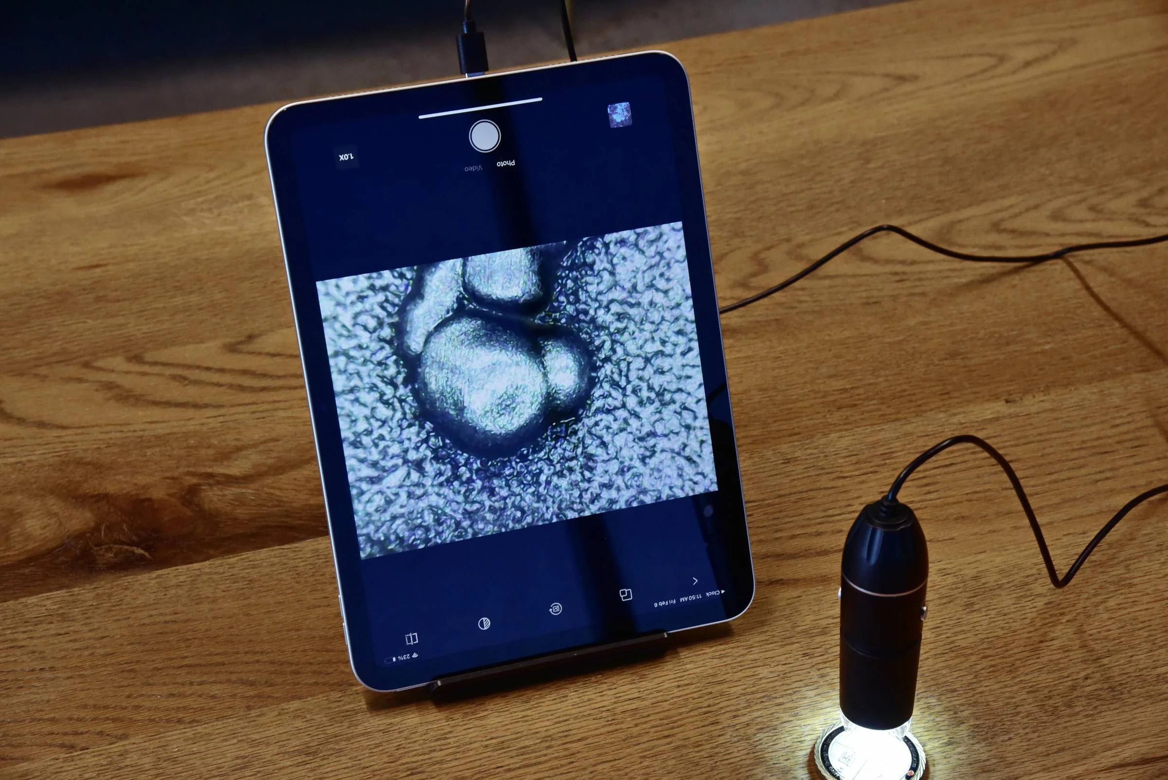 Microscope connected to iPad with ring light activated.