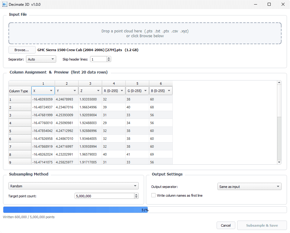 I decided to create a program, with the assistance of some AI tools, that skips the loading step and gets straight to subsampling, saving a lot of time when you’re working with huge point clouds. Just as importantly, the program doesn't hog resources as it's working, so you can let it run in the background and go about your business.